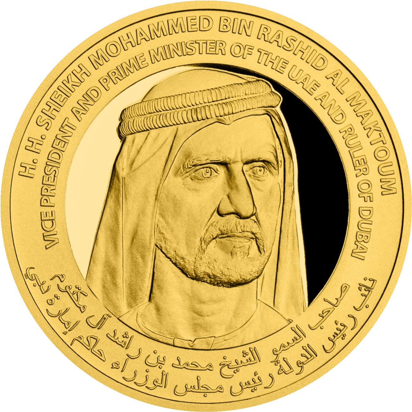 Commissioned by DMCC, this historic inaugural UAE gold bullion coin celebrates the nation's visionary leadership. Struck in 0.5 oz of pure 999.9 fine (24k) gold, it features a distinguished portrait of His Highness Sheikh Mohammed bin Rashid Al Maktoum, Vice President and Prime Minister of the UAE and Ruler of Dubai, on the obverse.