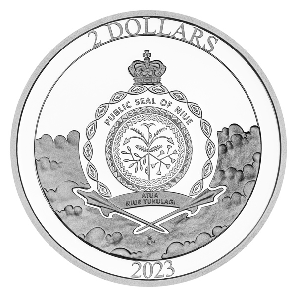 The reverse features a striking, realistic depiction of a pair of wings and a turbine over a cloudscape. Issued under the license of Niue, the obverse bears the national emblem, nominal value of 2 NZD, and year 2023, all set upon a cushion of clouds.