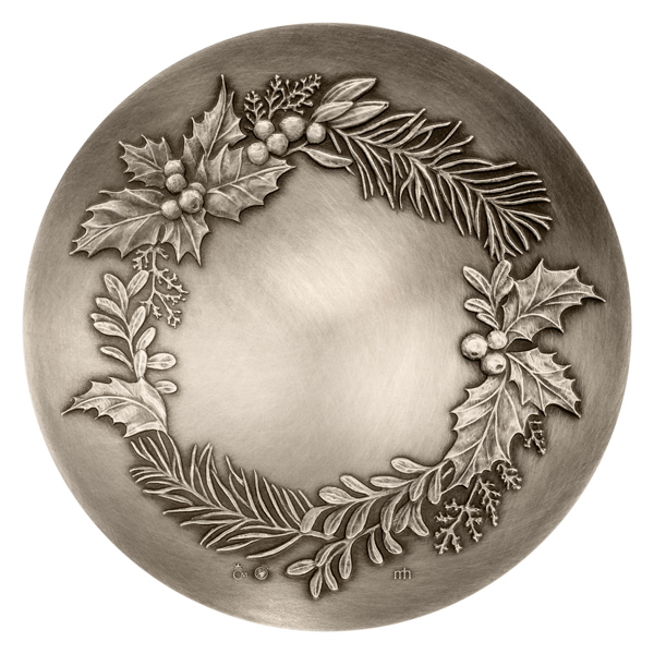 Created by medal maker Mgr. Art. Miroslav Hric, the obverse portrays the Holy Family Baby Jesus, Mary, and Joseph beneath the radiant Star of Bethlehem, with an ox and lamb resting below. The reverse features a finely detailed Christmas wreath of pine and holly.